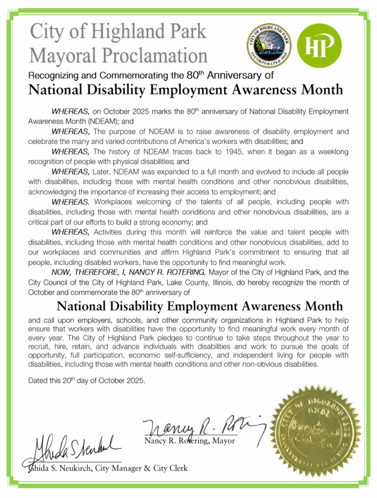 October is National Disability Employment Awareness Month (NDEAM, a time to recognize the contributions of workers with disabilities and promote inclusive employment practices. This year marks the 80th anniversary of NDEAM, and the City of Highland Park celebrated by issuing an official Mayoral Proclamation, and presented it to CEL at the October 20 City Council meeting.